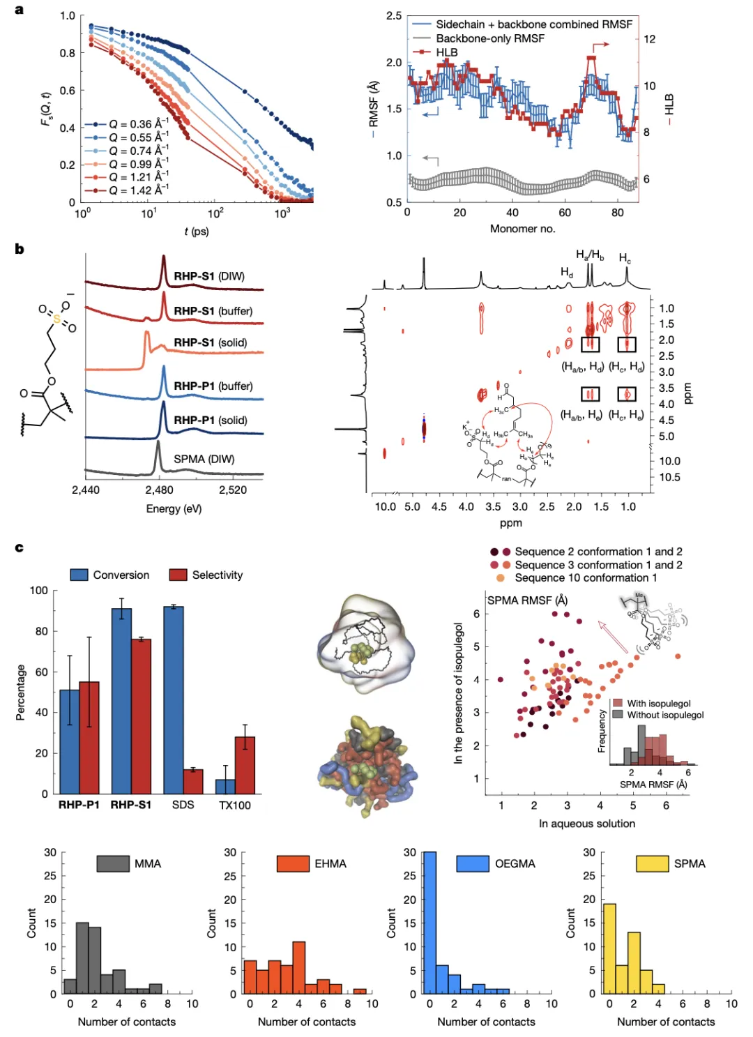设计起点来自对 1,378 个金属蛋白活性位点的统计:位点内部疏水,并呈现“少数关键残基高度特异+周边残基多样且频率近似”的双峰模式(见图1a)。作者据此以“关键单体”对应功能残基(如以 SPMA 作为酸催化等效位点),再通过单体配比与共聚活性比偏置关键单体邻域,使关键位点更常落入疏水段;滑动窗口 HLB 与主成分分析显示 RHP-S1 富集更多“含 SPMA 的疏水段”(见图1d),从而调控关键侧链的局域脱水与可动性。