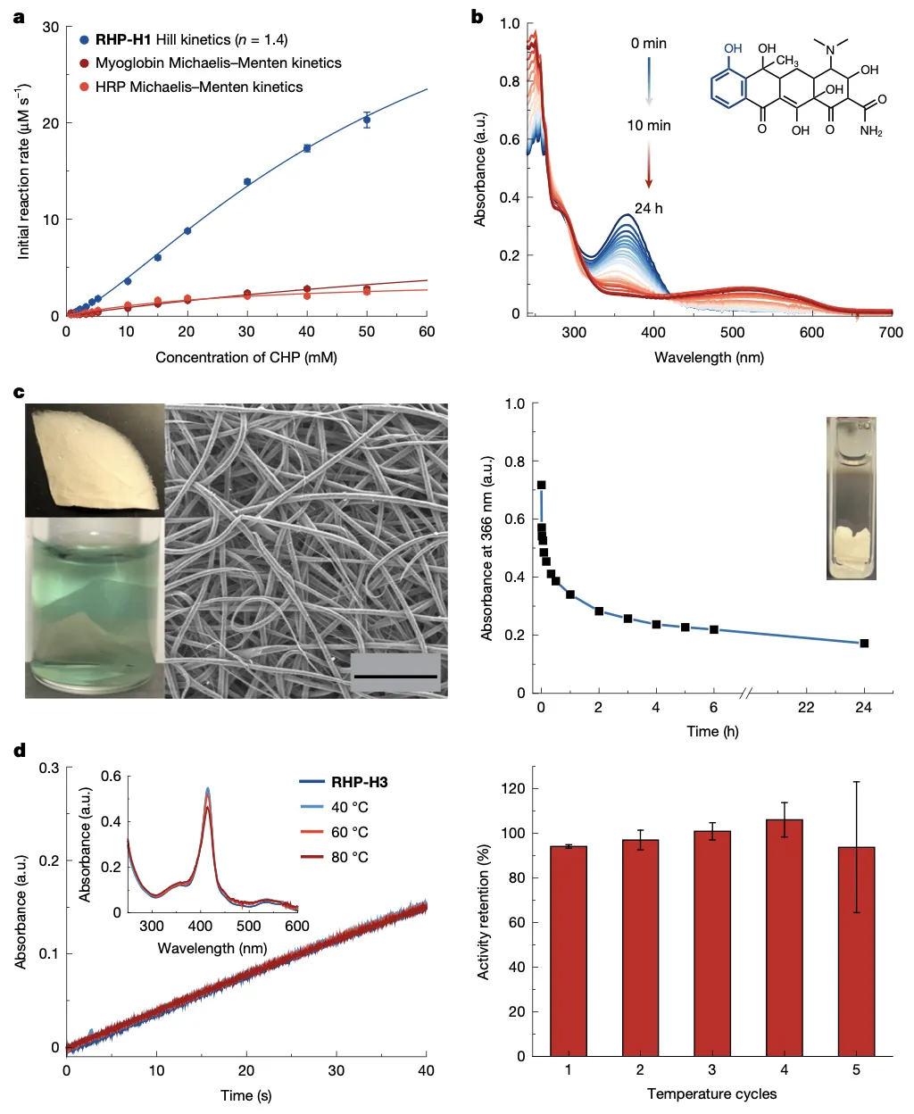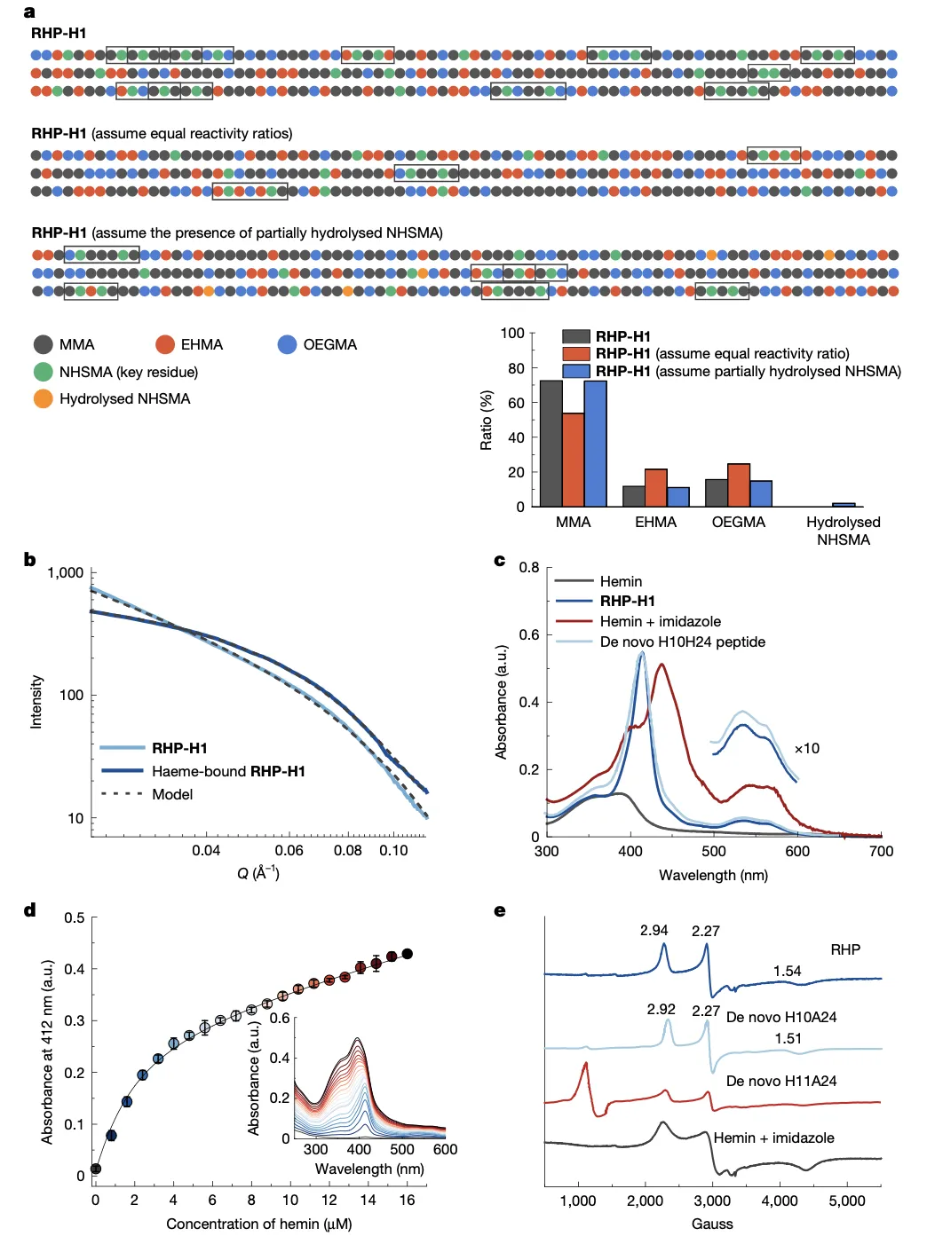 围绕香茅醛环化,作者用中子散射与分子动力学揭示 RHP 的段尺度动态异质性(见图2a),并以 XANES、NOESY 与分子动力学快照支持底物在 SPMA 邻域富集及相对脱水的伪活性位点图像(见图2b),与 SDS 和 Triton X-100 均<30% 烯烃选择性的对照相呼应(见图2c)。在氧化还原体系中,含 NHSMA 的 RHP 经组胺后修饰提供配位位点,结合血红素后回转半径由 4.1 nm 收缩至 3.6 nm(25 mM 磷酸盐缓冲液、pH≈8、100 mM KCl;见图3b),UV–Vis 与 EPR 对照指向类细胞色素的配位环境(见图3c、图3e);其进一步封装进聚己内酯电纺纤维并保留 8.3 ± 2.4% 溶液活性(n=3;见图4c),表明该类位点可在材料加工条件下维持可测的功能输出。