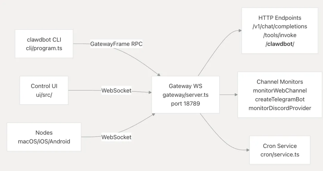 ClawdBot 的核心是一个运行在本地的 Gateway(网关),默认绑定到 127.0.0.1:18789。
