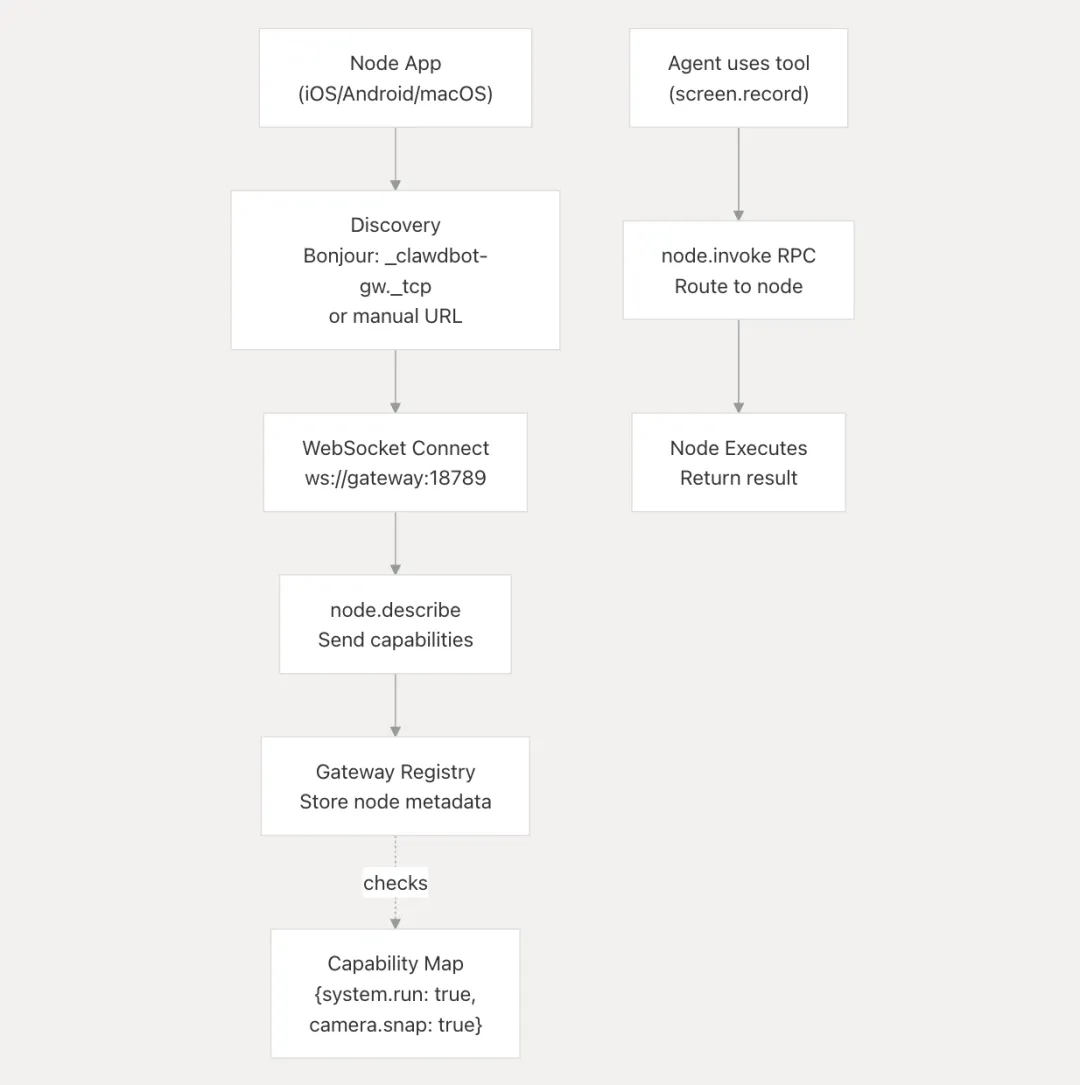 Gateway 通过 node.invoke RPC 调用,把需要本地执行的任务发给配对的 Node。Node 检查自己的权限(比如 macOS 的 Screen Recording 权限),然后执行任务(截图、操作相机等),把结果返回给 Gateway。