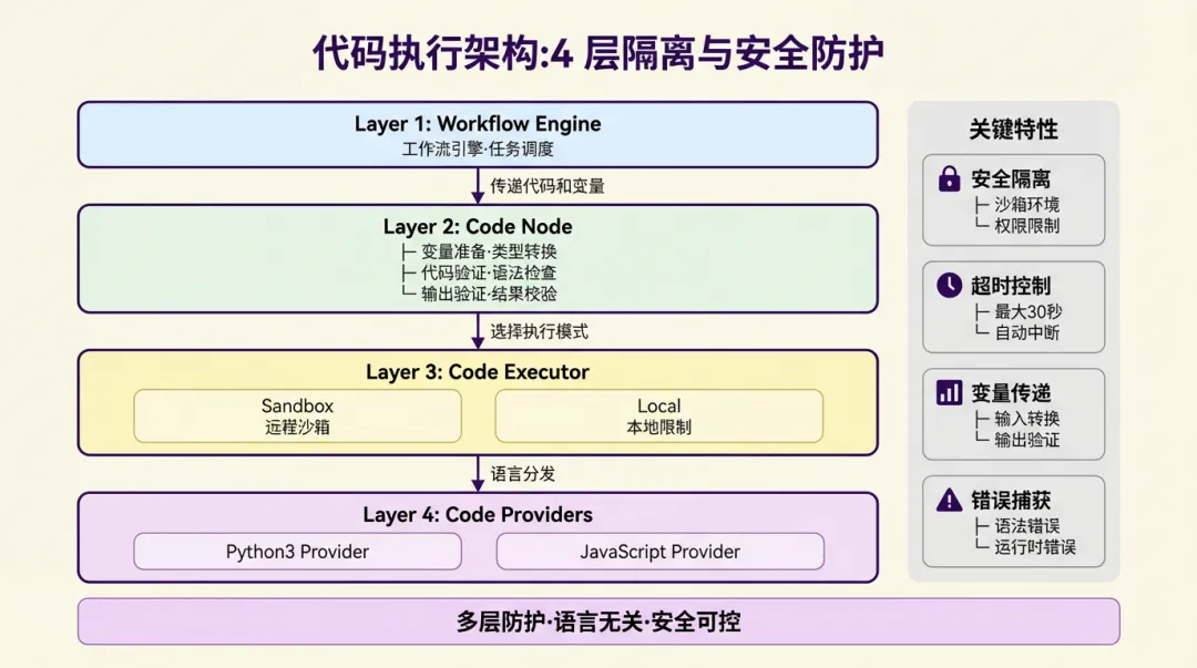 Dify 提供安全的代码执行沙箱环境,支持在工作流中执行 Python 和 JavaScript 代码,实现复杂的数据处理和业务逻辑。