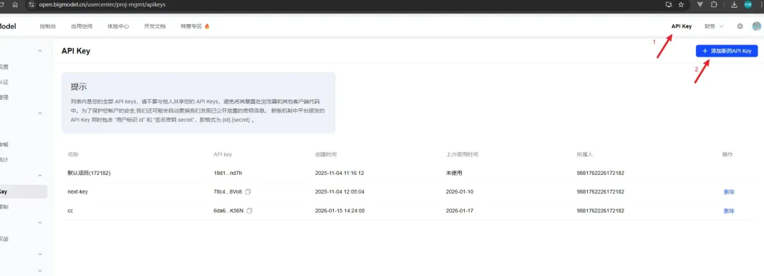- 获取 API Key登录智谱AI后台,获取您的 API Key。