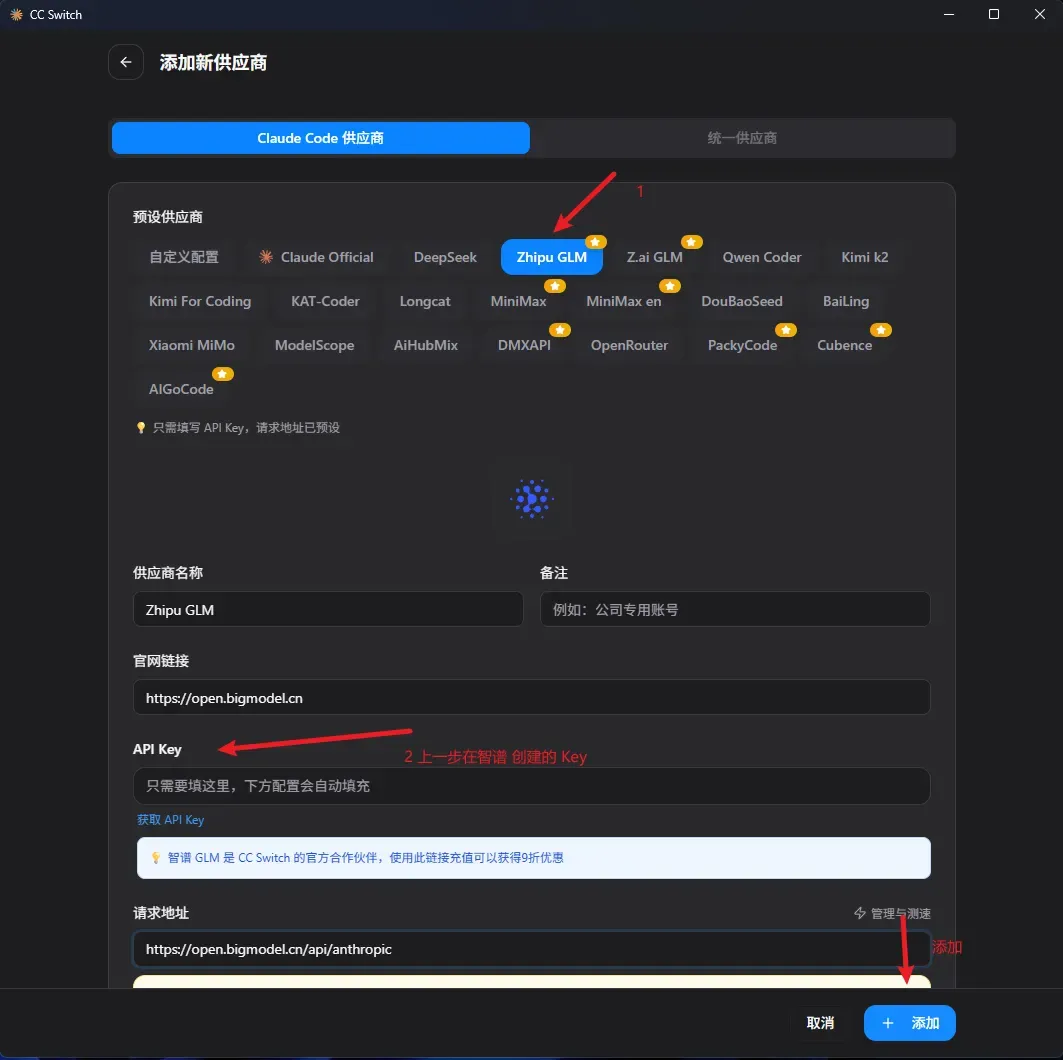 - 配置 cc-switch打开下载好的 cc-switch 工具,填入刚才获取的 API Key 进行可视化配置。