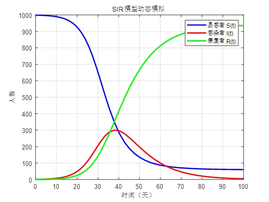 假设总人数:N = 1000 ,感染率β= 0.3,康复率γ=0.1。