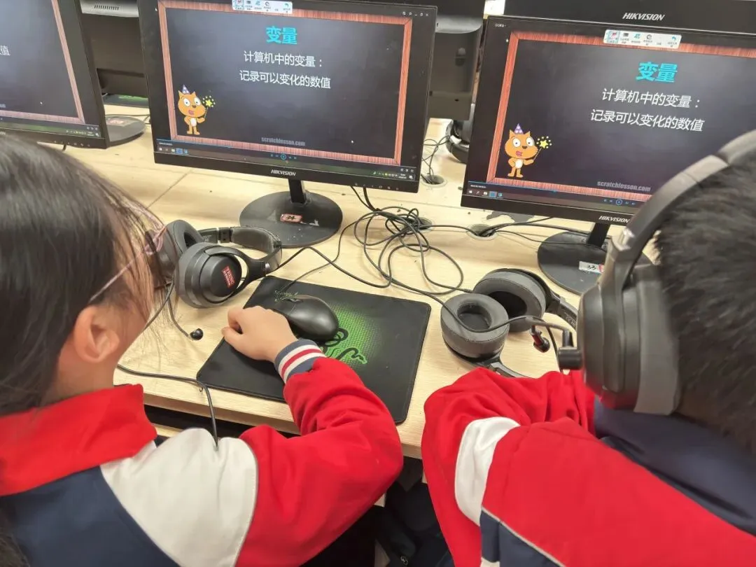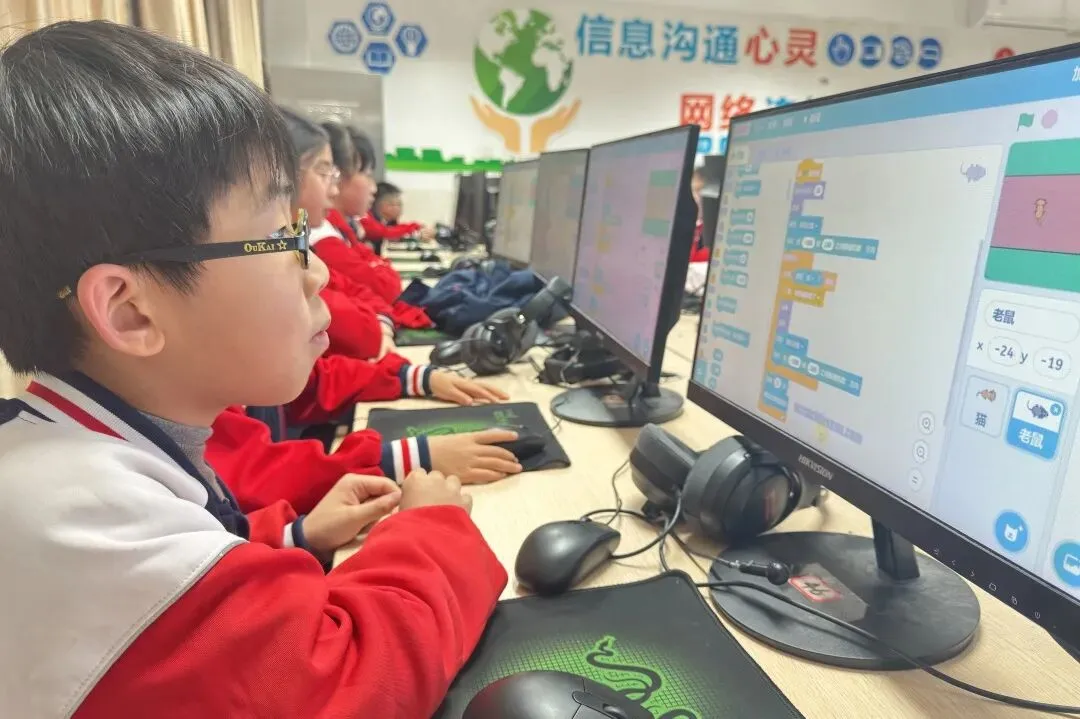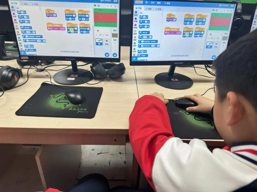 在进阶学习中,经典的《猫捉老鼠》项目成为孩子们展现编程实力的舞台。我们一同搭建完整的追逐机制:给老鼠设置 “随机移动 + 克隆” 指令,让它们不仅灵活逃窜,还能源源不断地在舞台上出现;为小猫配置 “键盘控制” 功能,使其能根据老鼠位置灵活调整方向、快速追赶;借助计时器设计难度递增模式,游戏时间越久,老鼠移动速度越快,挑战感十足!当孩子们看着自己设计的猫鼠游戏流畅运行,与小伙伴比拼抓捕战绩时,那份发自内心的快乐与自信,比任何奖励都更为珍贵,这也是南门中特小学复兴少年宫素质教育成果的鲜活展现。