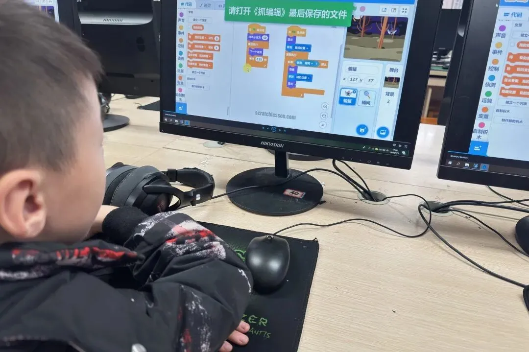 很快,我们迎来了第一个完整的游戏项目 ——“蝙蝠捕网”。孩子们化身小小游戏设计师,亲手绘制捕网角色,细致调整造型中心,确保碰撞检测精准无误;为蝙蝠添加 “重复执行” 代码,让它忽上忽下随机移动,巧妙增加游戏抓捕难度;更创意加入计分功能,捕到蝙蝠即可累积分数,让游戏体验感瞬间拉满!当小组合作完成的游戏第一次成功运行,孩子们兴奋地互相挑战比拼,教室里洋溢着纯粹的快乐与满满的成就感。