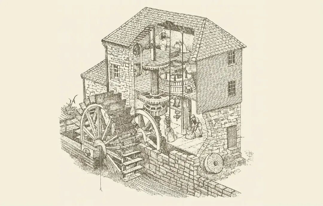 一个依靠水轮提供动力的磨坊。水力强大但不可靠,且将磨坊限制在少数地点并受季节影响。