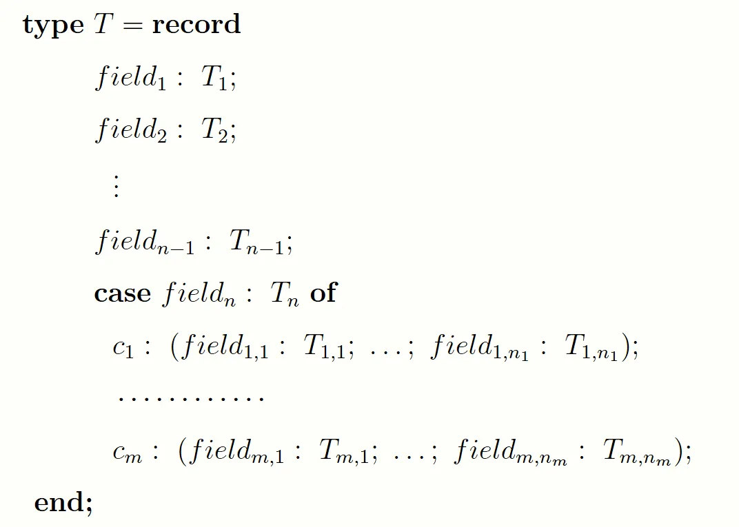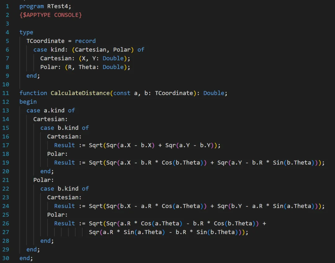 我们今天讨论变体记录(variant record)类型。所谓变体记录类型,是指含有变体部分的记录类型。type TCoordinate = record case Kind: (Cartesian, Polar) of Cartesian: (X, Y: real); Polar: (R, Theta: real); end;