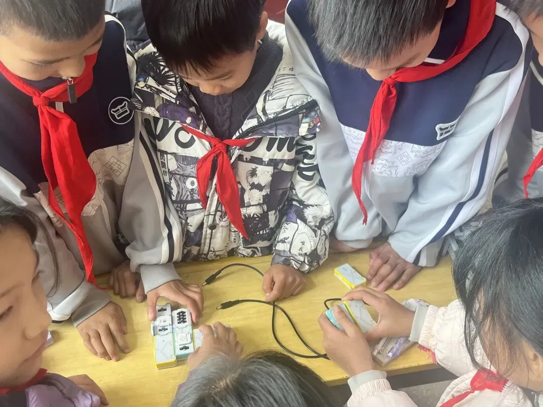 在知识科普环节,队员们通过图片、视频等多种形式,深入浅出地介绍了编程的发展历程和未来趋势,拓宽了孩子们的科技视野。为了让孩子们更好地理解和掌握编程知识,实践队员还设计了丰富的动手实践环节。孩子们像玩拼图一样,在老师的指导下拖拽不同形状的指令模块,拼接出各种指令模型。在这个过程中,他们不仅亲身体验了编程的乐趣,还在互动中理解了“顺序”“循环”等基础编程指令,初次体验到了完成指令的成就感。
