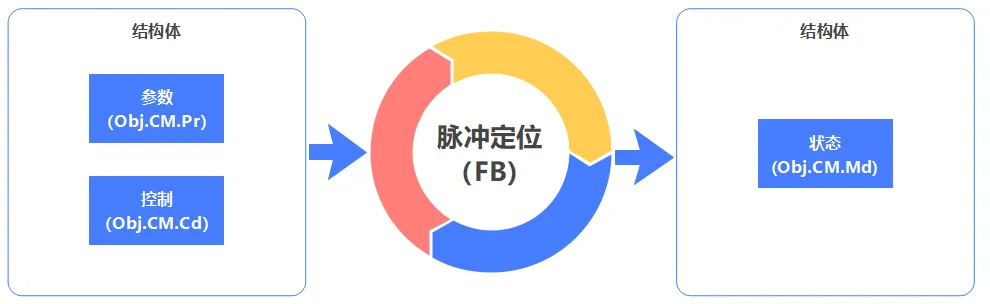 其中Obj标签名我们称之为对象,两个结构体是为对象的输入输出进行数据指定化,且功能块仅接受结构体内已指定好的数据类型,当我们需要访问定位功能时,我们需要创建FB标签并在程序里声明创建相应的功能块,无需关心功能块的在程序里的位置,只需要程序里有并扫描执行即可,若我们需要监视或者控制这个功能块对象时,我们只需要对声明的结构体标签名数据进行访问即可,无需关心功能块内部的工作过程。