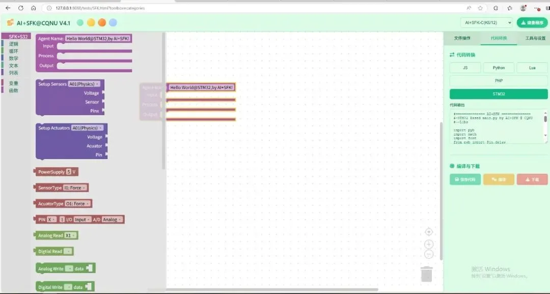 AI+SFK@CQNU V4.1 是一款基于Blockly的图形化编程教育平台,专为中小学生和编程初学者设计。平台将复杂的STM32嵌入式编程转换为直观的积木块拖拽操作,支持AI智能代码生成,让学习嵌入式编程变得简单有趣。
