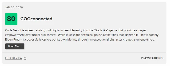 说起来,2026 年的游戏圈似乎特别流行“评分大乱斗”。就在大家还在纠结《生化危机 9》的动作性与恐怖感平衡时,万代南梦宫的二次元类魂新作《噬血代码 2》(Code Vein 2)在1月27日正式解禁了媒体评测。