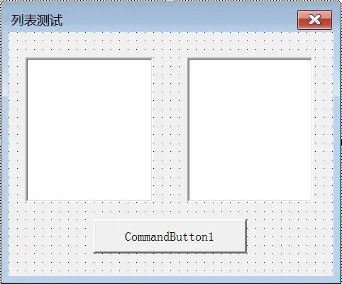 在“工程”窗口添加新的用户窗体,并命名为frmTest2。窗体中添加两个列表,分别是ListBox1(左)和ListBox2(右),并将ListBox1控件的MultiSelect属性设置为1-fmMultiSelectMulti;另外创建按钮CommandButton1,如下图所示。