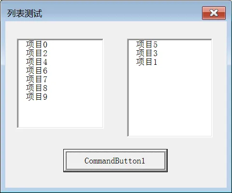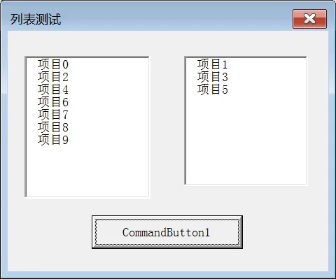 代码中,按索引反向访问ListBox1列表的项目,并使用Selected()方法判断项目是否被选中;对于选中的项目,首先添加到ListBox2列表中,然后通过ListBox1列表的RemoveItem()方法删除此项。如下图就是选中了项目1、项目3、项目5并点击CommandButton1按钮后的结果。