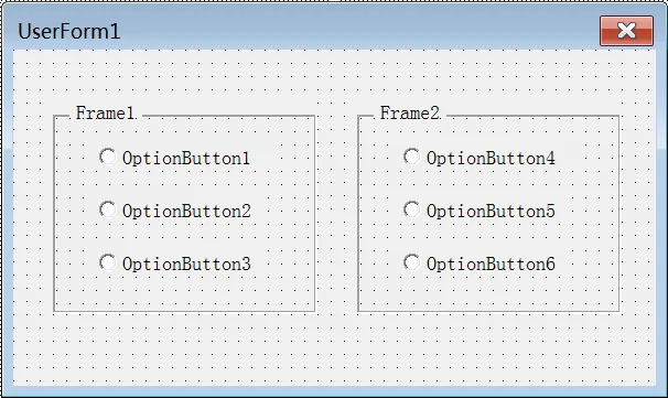 如图中所示,窗体中创建了两个框架Frame1和Frame2,每个框架中分别创建了三个单选按钮;每个框架中的单选按钮一次只能选中一个,并且,两个框架中的单选按钮互不干扰。