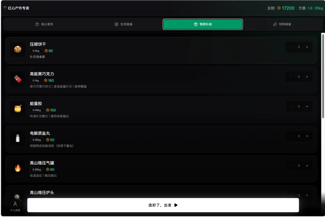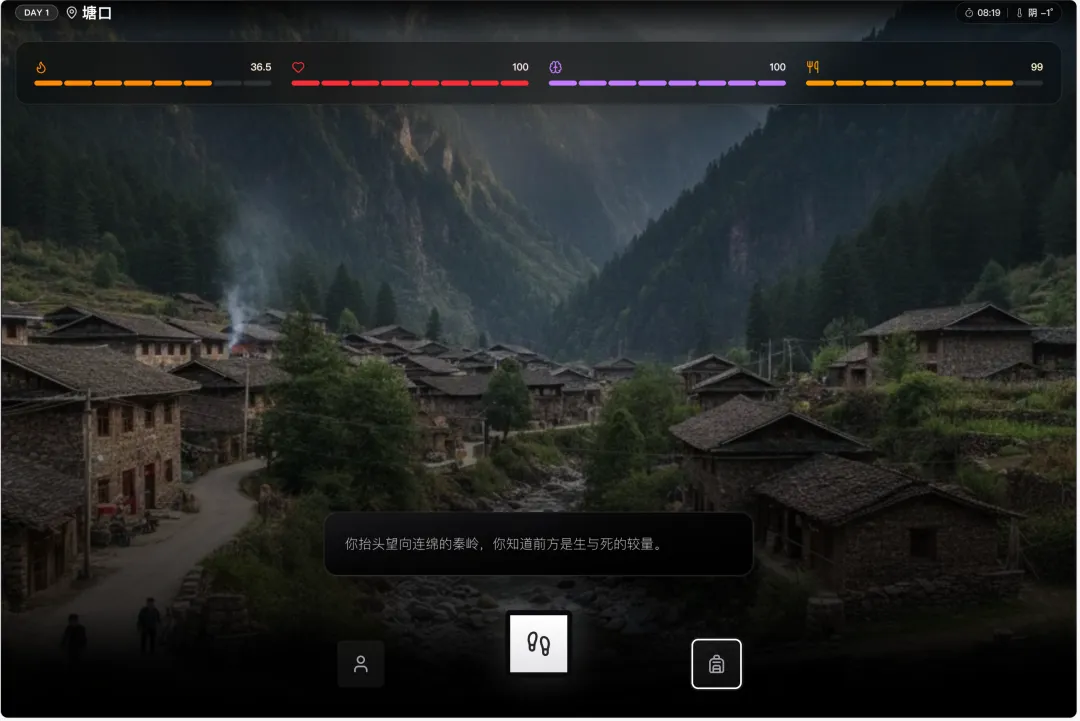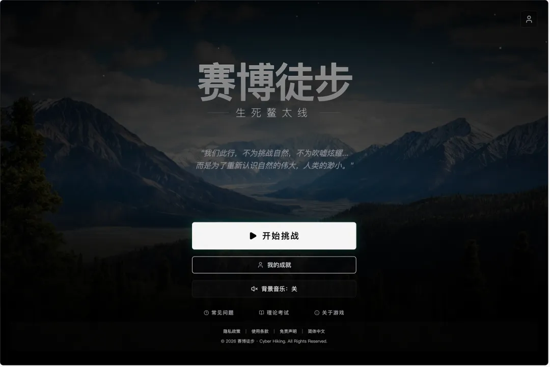 一款结合了真实户外生存模拟的硬核文字游戏,年初一度成为社交媒体上的现象级游戏。游戏原型是中国秦岭著名的徒步路线——鳌太线。这条线路因地理环境极端、天气无常、且属于“无人区”而极其危险,现实中多有伤亡事故发生。而在年初,又有驴友遇难,成为舆论热点。该款游戏最初在小红书发布,一经推出,就获得大量关注,尤其是游戏难度比较高,相当多人晒出自己的生存时间。游戏界面是典型的 H5 文游,由文字描述、插图和简单的数值界面,玩家通过阅读文字来想象荒野的景象。游戏内容就是围绕鳌太线的路径,根据不同情景设计突发事件,让玩家尽可能真实感受穿越鳌太线的紧张和危险,同时游戏中涉及的许多野外生存常识、气候变化规律以及地理环境细节都非常接近现实。🔗 https://cyberhiking.com/类似的 H5文游模拟器还有最近挺火爆的《青椒模拟器》《青椒模拟器》