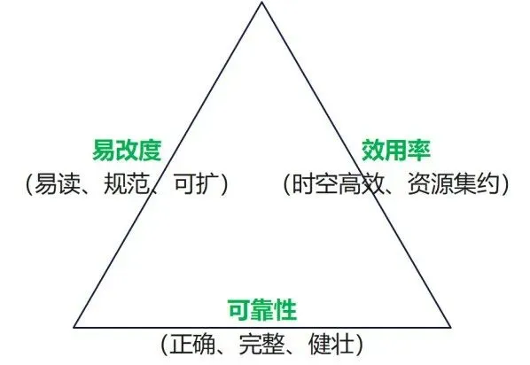 一般来说,“可靠性”是第一位的,这是程序运行的基础,是必须的;然后是“易改度”,因为程序构建过程中,不太可能一蹴而就,通常需要调试、修改或后期扩展以及团队合作,那么易读、好改、可扩展就显得比较重要了;最后是追求运行时间、内存占用、代码长度、IO资源等方面的高效集约利用了。