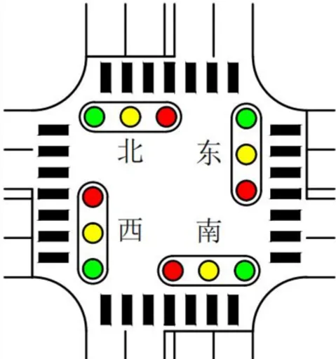 状态1:南北方向的绿灯点亮,同时东西方向的红灯点亮;