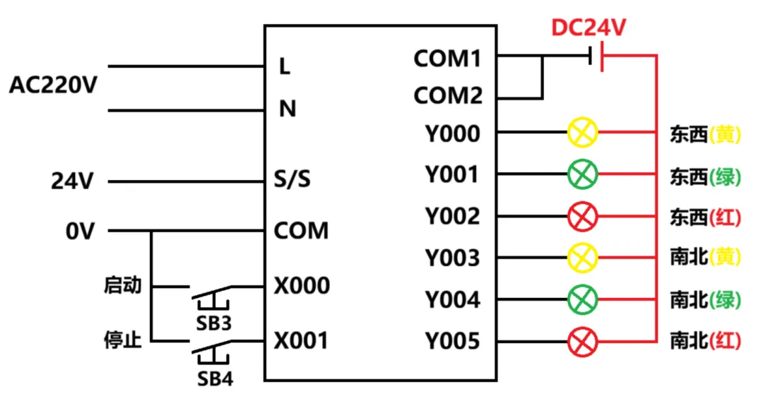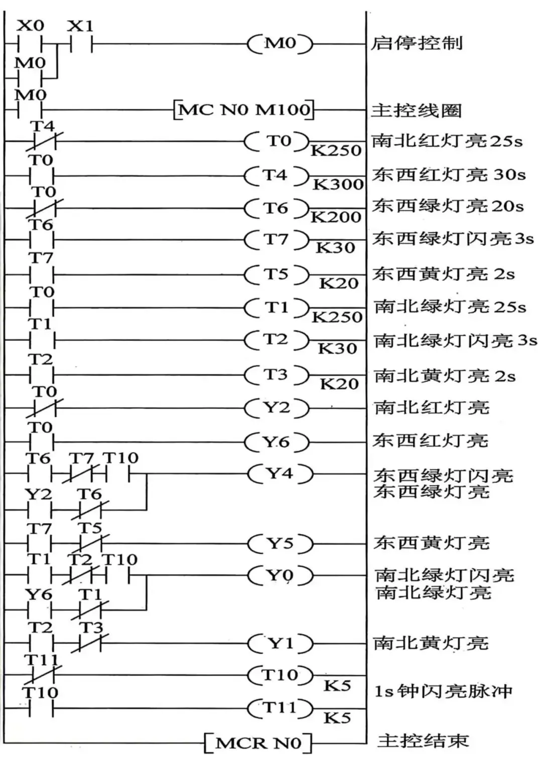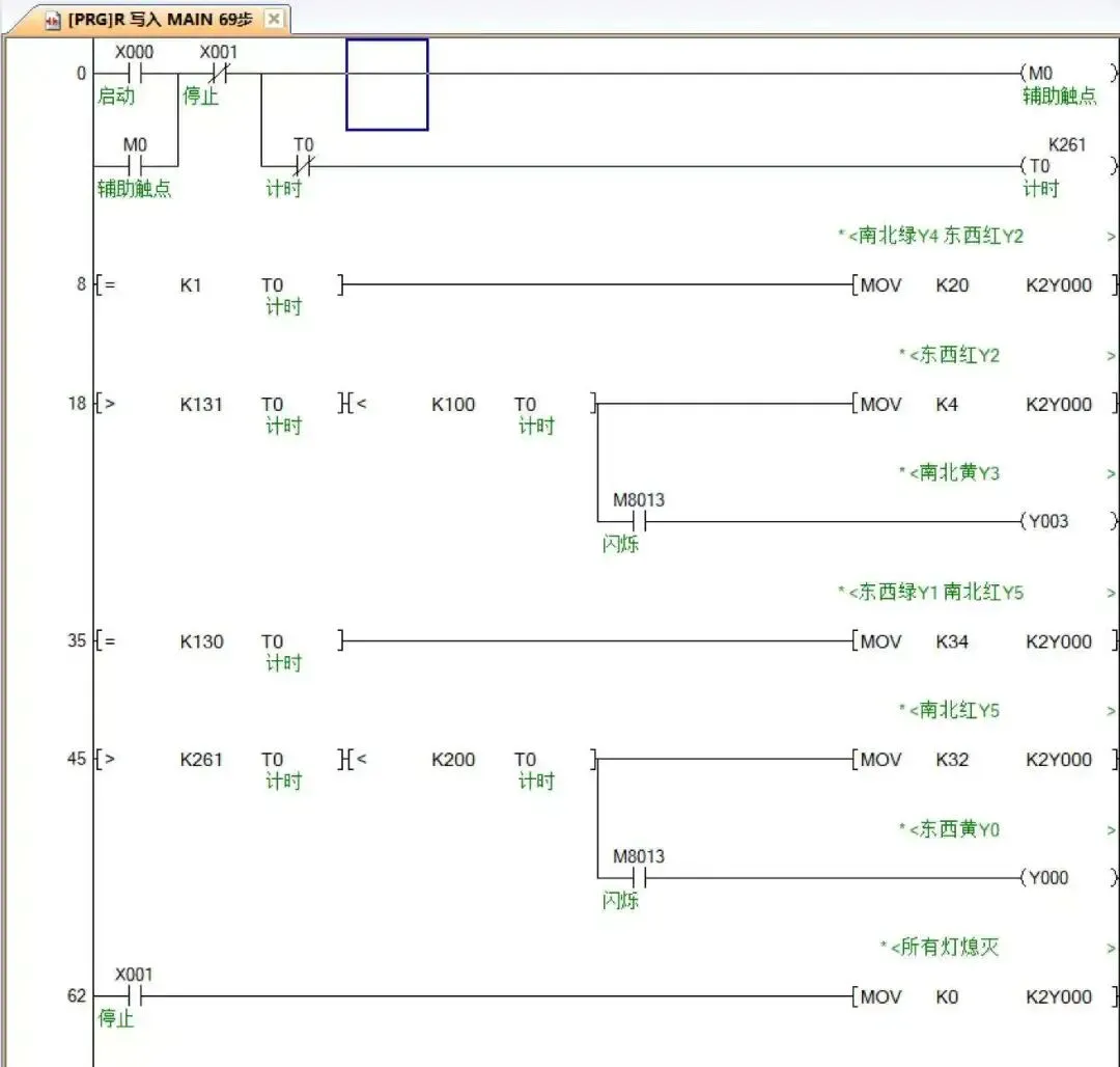 与一般的继电器接触器控制方式类似,根据控制要求的逻辑顺序及对应IO口,编写对应的控制代码。其基本原则是“一 一 对 应”。上图程序与本例有所不同,主要是Y0~Y5连接的红绿灯有区别,时间长短这个可以不管它。但思路就是上面这样,稍微修改即可符合本文案例需求,读者可自行动手锻炼一下