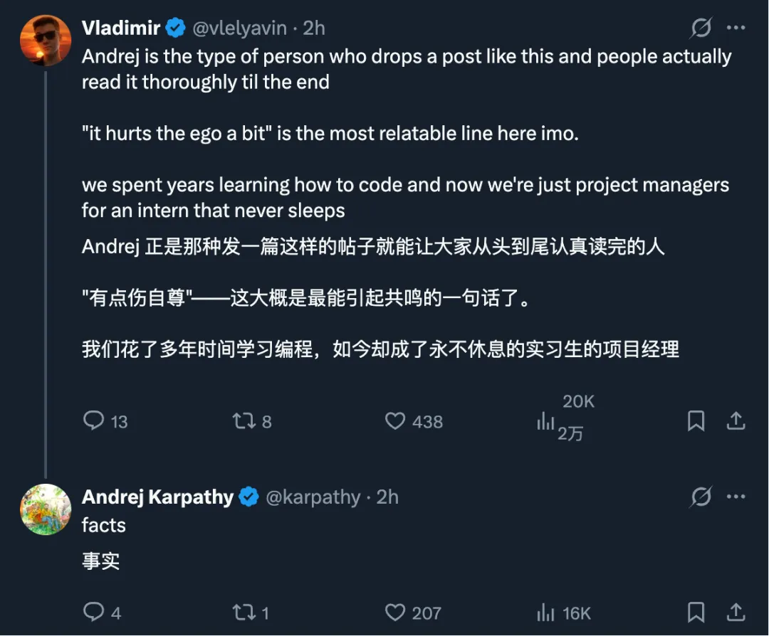 Karpathy 说的"有点伤自尊"很真实,但这是个心态调整问题: