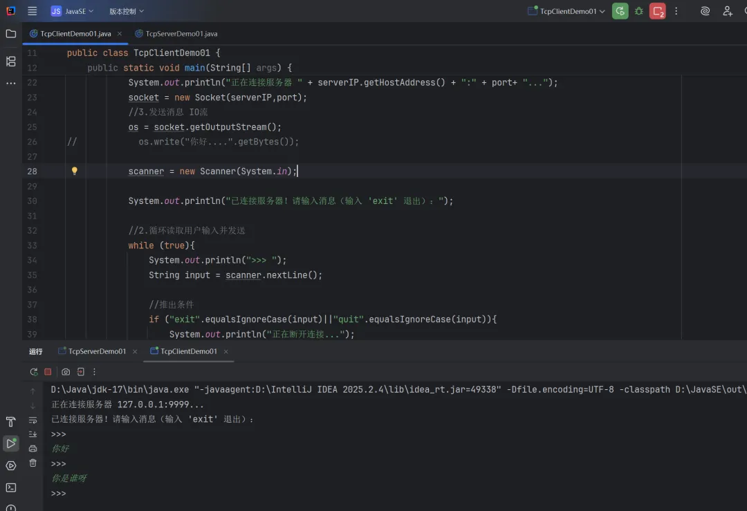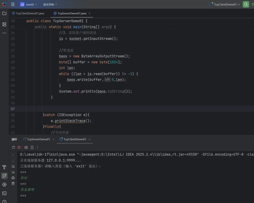 package lesson01;import java.io.IOException;import java.io.OutputStream;import java.net.InetAddress;import java.net.Socket;import java.net.UnknownHostException;import java.util.Scanner;//TCP客户端public class TcpClientDemo01 { public static void main(String[] args) { Socket socket = null; OutputStream os = null; Scanner scanner = null; try{ //1、要知道服务器的地址,端口号 InetAddress serverIP = InetAddress.getByName("127.0.0.1"); int port = 9999; //2.创建一个socket连接 System.out.println("正在连接服务器 " + serverIP.getHostAddress() + ":" + port+ "..."); socket = new Socket(serverIP,port); //3.发送消息 IO流 os = socket.getOutputStream();// os.write("你好....".getBytes()); scanner = new Scanner(System.in); System.out.println("已连接服务器!请输入消息(输入 'exit' 退出):"); //2.循环读取用户输入并发送 while (true){ System.out.println(">>> "); String input = scanner.nextLine(); //推出条件 if ("exit".equalsIgnoreCase(input)||"quit".equalsIgnoreCase(input)){ System.out.println("正在断开连接..."); break; } //发送消息(带换行符,方便服务器按行读取) os.write((input + "\n").getBytes("UTF-8")); os.flush(); } } catch (Exception e) { e.printStackTrace(); }finally { if (os!=null){ try{ os.close(); }catch (IOException e){ e.printStackTrace(); } } if (socket!=null){ try { socket.close(); } catch (IOException e) { e.printStackTrace(); } } } }}