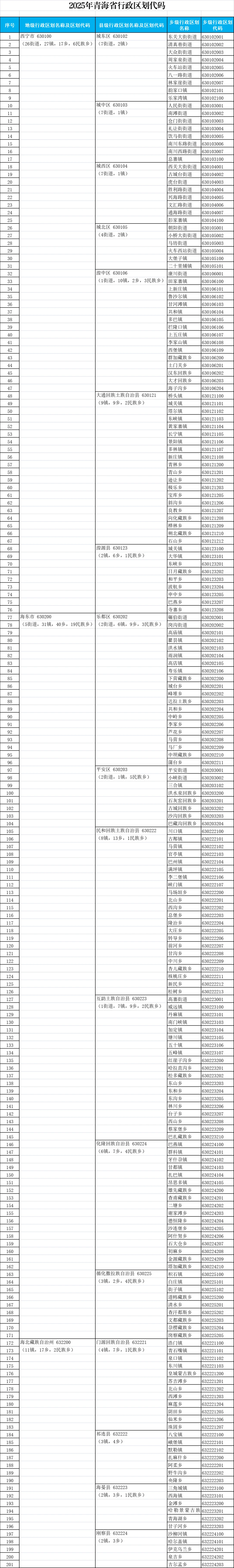2026年1月27日,青海省民政厅公布《2025年度青海省行政区划代码公告》:截至2025年12月31日,青海省共有地级8个,其中地级市2个、自治州6个;县级45个(含大柴旦行委),其中县级市5个、市辖区7个、县25个、民族自治县7个;乡级405个,其中街道43个、镇140个、乡194个、民族乡28个。现对全省区行政区划代码予以公布。