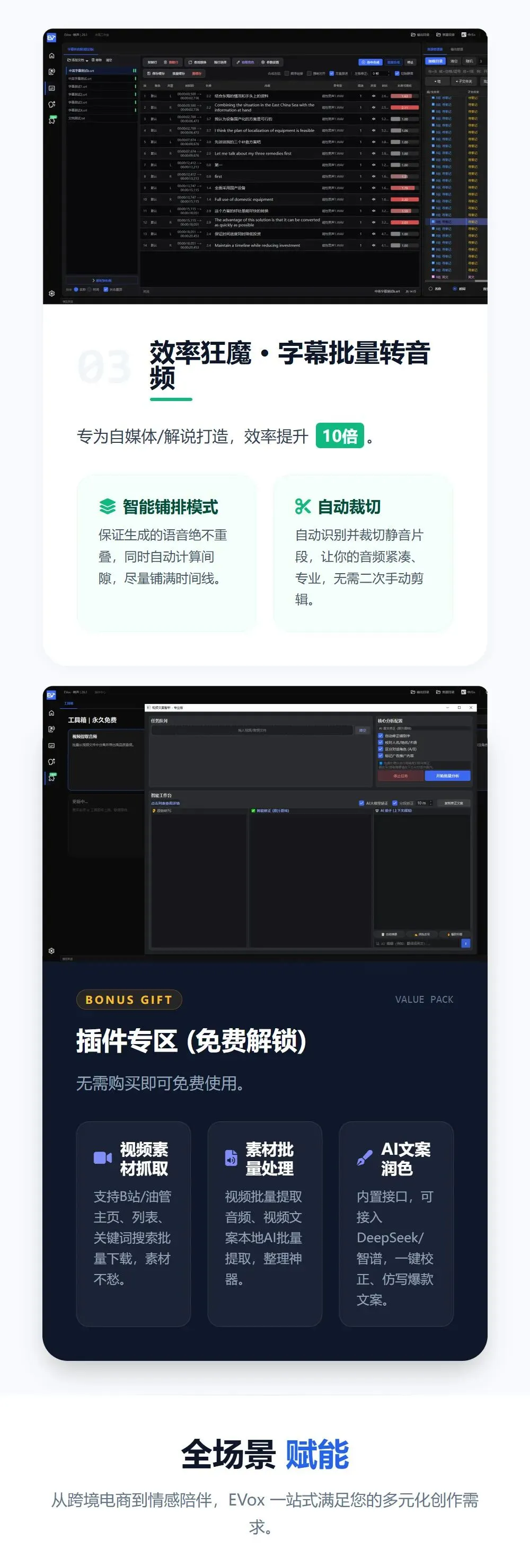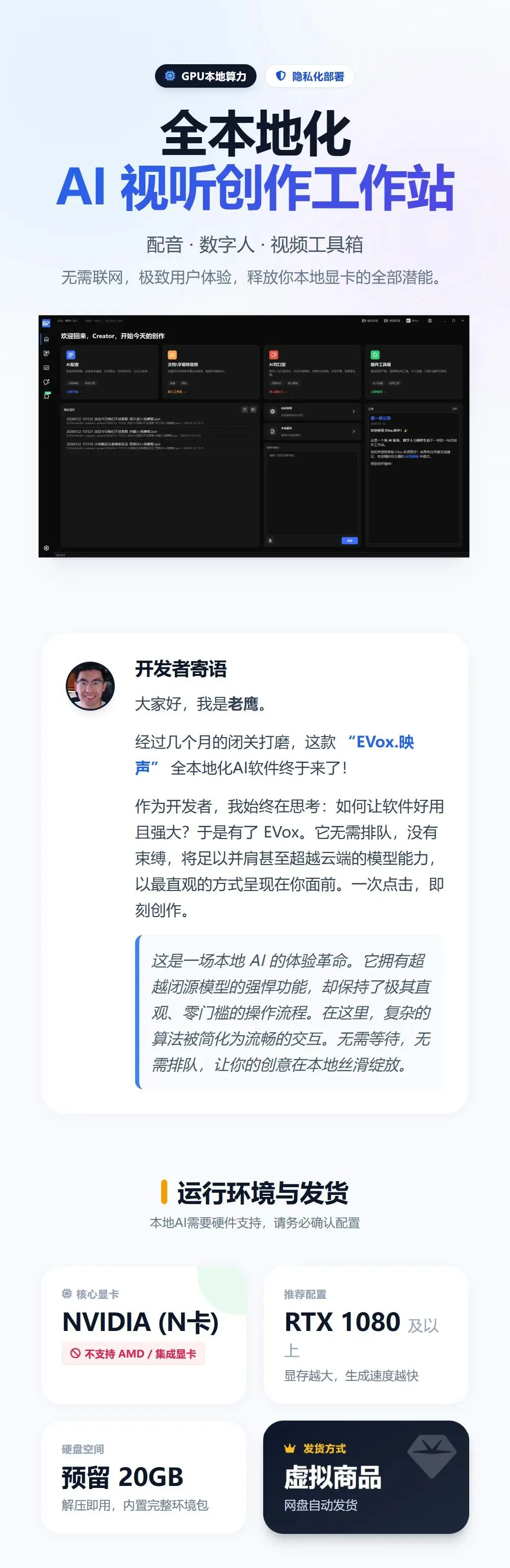 于是在经历无数次迭代,从产品设计到前端、后端算法优化、服务器部署、用户管理系统、软件的加密打包...完全一个人,完全没用过python,一行代码都没写的情况下,开发出来这款EVox.映声AI配音-AI数字人-全本地化软件。