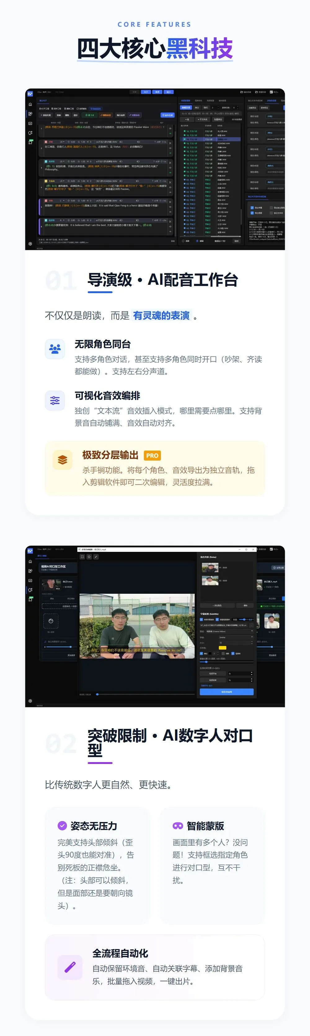 智能关联:支持自动关联字幕,支持框选画面中不同角色并指定独立音频。