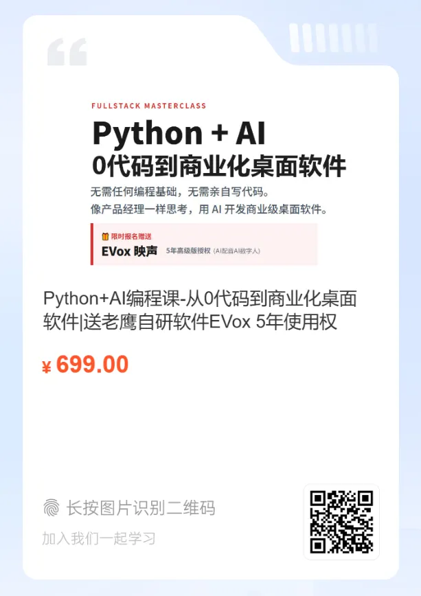 另外,我也开发了一套AI编程课,无需任何代码基础,纯自然语言编程,从0到商业化软件的落地,目前预售中,欢迎大家关注。购买课程后加我微:laoying0140 送EVox映声5年使用权。