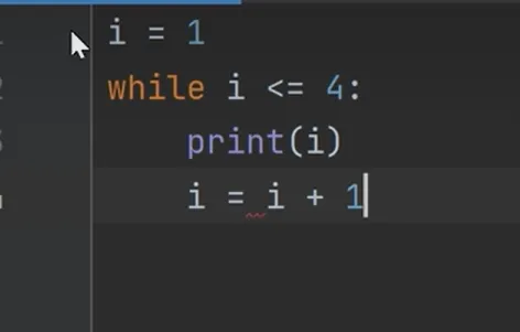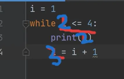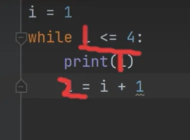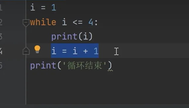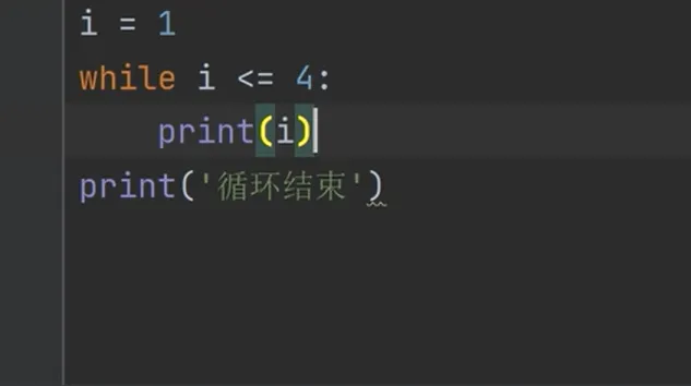 先模拟一下程序的执行流程,首先把1赋值量i,接下来执行while语句,先判断条件,条件是1 <= 4成立,所以执行后面的语句块print的函数会输出1,之后给变量i+1,变量i的值是2