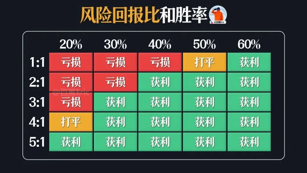 从图片中我们可以看到,如果你的盈亏比1:1那么就需要60%的胜率,才能实现“盈利”。