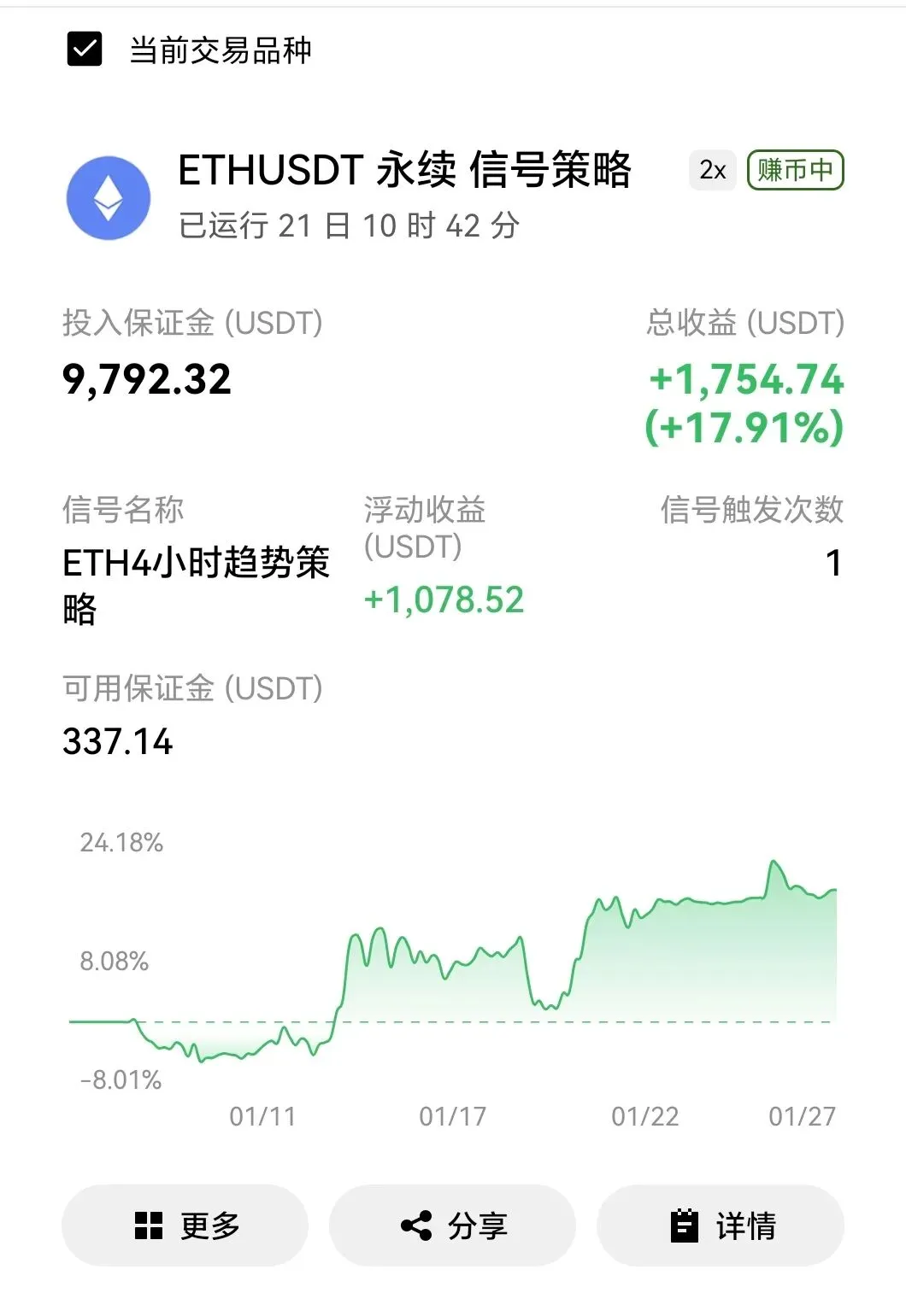 下面是目前从2026年1月6日对接实盘,本金10000美元,到现在21天时间,目前策略做了2比交易,一笔多单,一笔空单,目前还持有空单中,截至现在2026年1月27日,盈利1754美金,标的:ETH,2X杠杆。