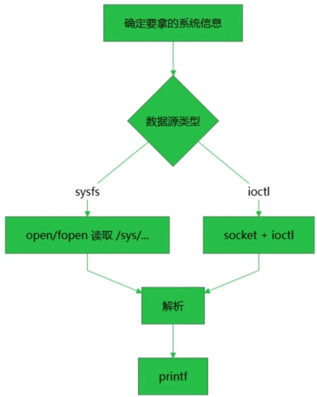先放一个通用思路:无论从 sysfs 读文件,还是用 ioctl 拿网卡信息,核心都是“选数据源 → 读取 → 解析 → 格式化输出”。