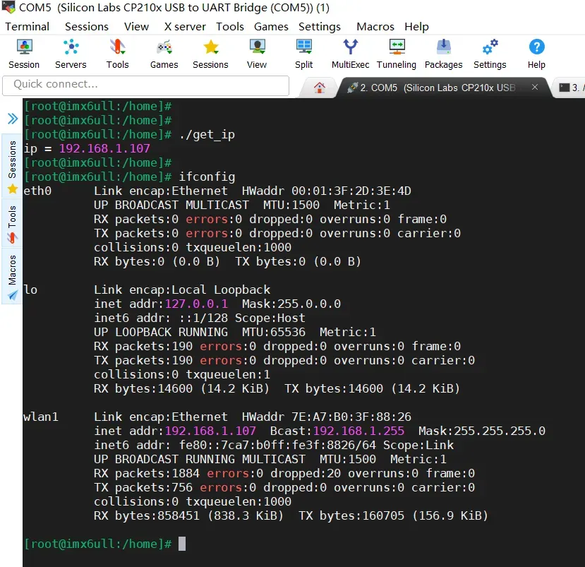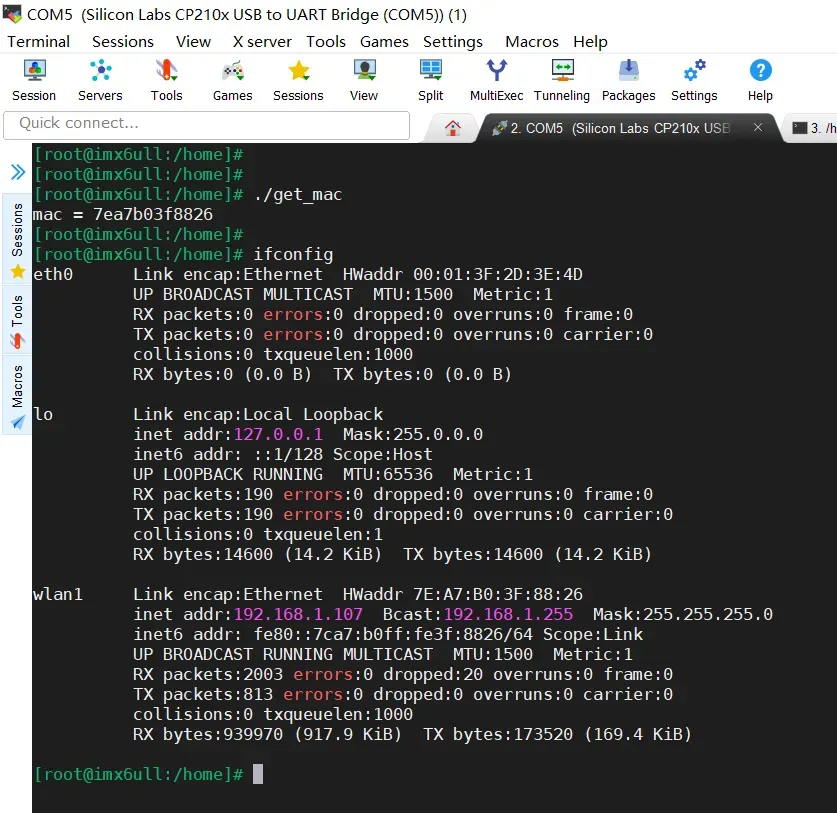#include<stdio.h>#include<stdint.h>#include<net/if.h>#include<sys/socket.h>#include<sys/ioctl.h>#include<arpa/inet.h>#include<unistd.h>#include<string.h>intget_netif_mac(constchar *_ifr_name, char *_mac){int32_t ret = -1;structifreqm_ifreq;int32_t sock = 0; sock = socket(AF_INET, SOCK_STREAM, 0);if (sock < 0) {printf("socket err\r\n");goto err; }strncpy(m_ifreq.ifr_name, _ifr_name, IFNAMSIZ); m_ifreq.ifr_name[IFNAMSIZ - 1] = 0; ret = ioctl(sock,SIOCGIFHWADDR, &m_ifreq);if (ret < 0) {printf("ioctl err:%d\r\n",ret);goto err; }snprintf((char *)_mac, 32, "%02x%02x%02x%02x%02x%02x", (uint8_t)m_ifreq.ifr_hwaddr.sa_data[0], (uint8_t)m_ifreq.ifr_hwaddr.sa_data[1], (uint8_t)m_ifreq.ifr_hwaddr.sa_data[2], (uint8_t)m_ifreq.ifr_hwaddr.sa_data[3], (uint8_t)m_ifreq.ifr_hwaddr.sa_data[4], (uint8_t)m_ifreq.ifr_hwaddr.sa_data[5]);return0;err:return-1;}intmain(int argc, char **argv){char mac_str[32] = {0}; get_netif_mac("wlan1", mac_str);printf("mac = %s\n", mac_str);return0;}运行结果: