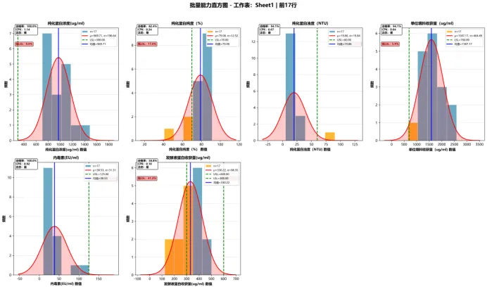 •发酵液蛋白收获量合格率仅58.8%(7个超规格),纯化蛋白纯度合格率82.4%,需重点优化。