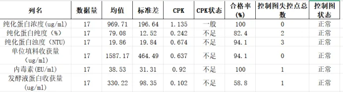 •纯化蛋白浊度(3个)、纯度(2个)、内毒素(1个)、发酵液收获量(1个)存在少量失控点,均为偶然波动,无系统性偏差。