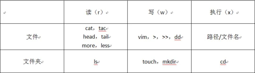 r(读)、w(写)、x(执行)对应操作命令如下所示