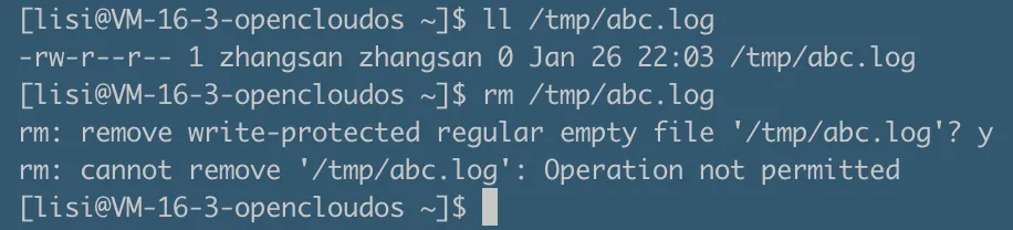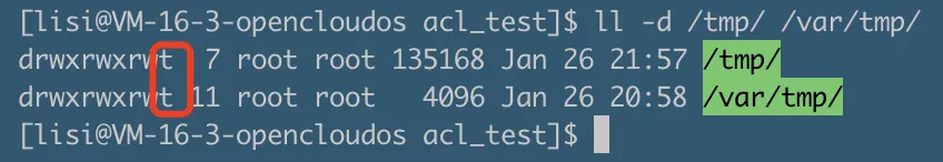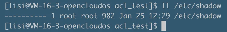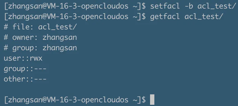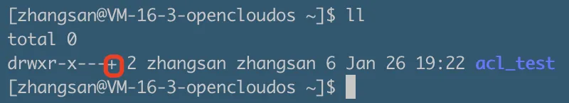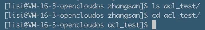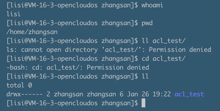 [lisi@VM-16-3-opencloudos zhangsan]$ ll acl_test/ls: cannot open directory 'acl_test/': Permission denied[lisi@VM-16-3-opencloudos zhangsan]$ cd acl_test/-bash: cd: acl_test/: Permission denied