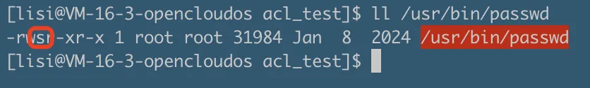 [lisi@VM-16-3-opencloudos acl_test]$ ll /usr/bin/passwd-rwsr-xr-x 1 root root 31984 Jan 8 2024 /usr/bin/passwd