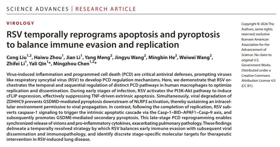 呼吸道合胞病毒(RSV)是导致全球婴幼儿及免疫力低下人群严重下呼吸道感染的主要病原体,其复杂的免疫逃逸机制使得疫苗与特效药研发长期受阻。2026年1月,一项发表于《Science Advances》的研究《RSV temporally reprograms apoptosis and pyroptosis to balance immune evasion and replication》系统揭示了RSV通过精准操控宿主细胞死亡程序,实现免疫逃逸、高效复制并加剧疾病的完整策略。该研究不仅深化了对病毒致病机制的理解,更为开发阶段特异性抗病毒疗法提供了清晰的分子图谱。