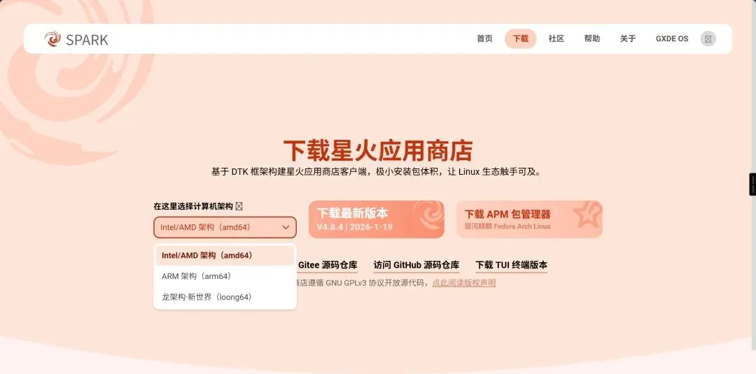 如果你已经正确选择了正确的计算机架构(amd64、arm64 或 loong64),点击下一步将自动下载最新版本的星火应用商店安装包。