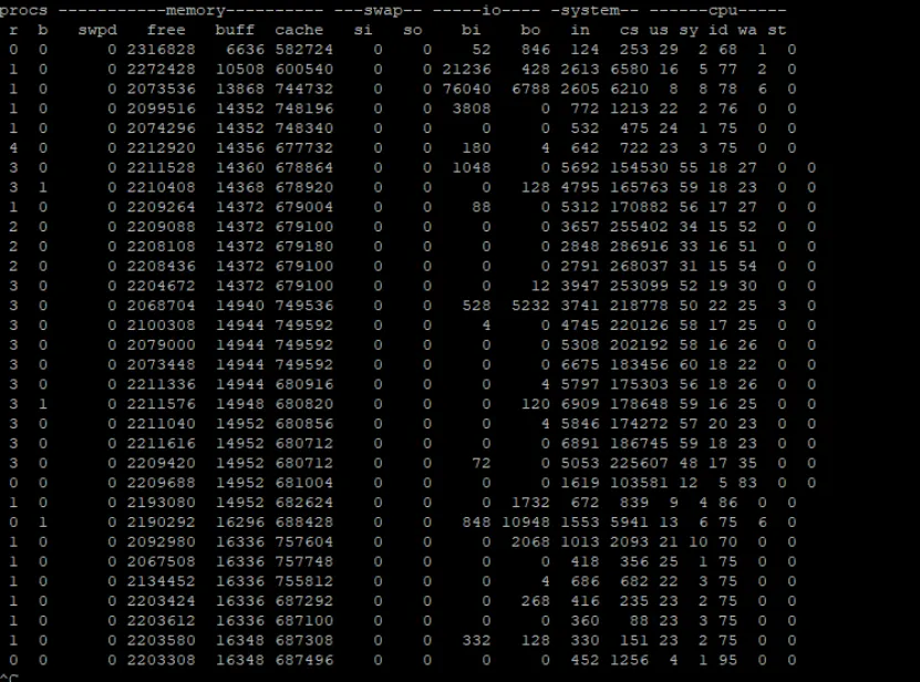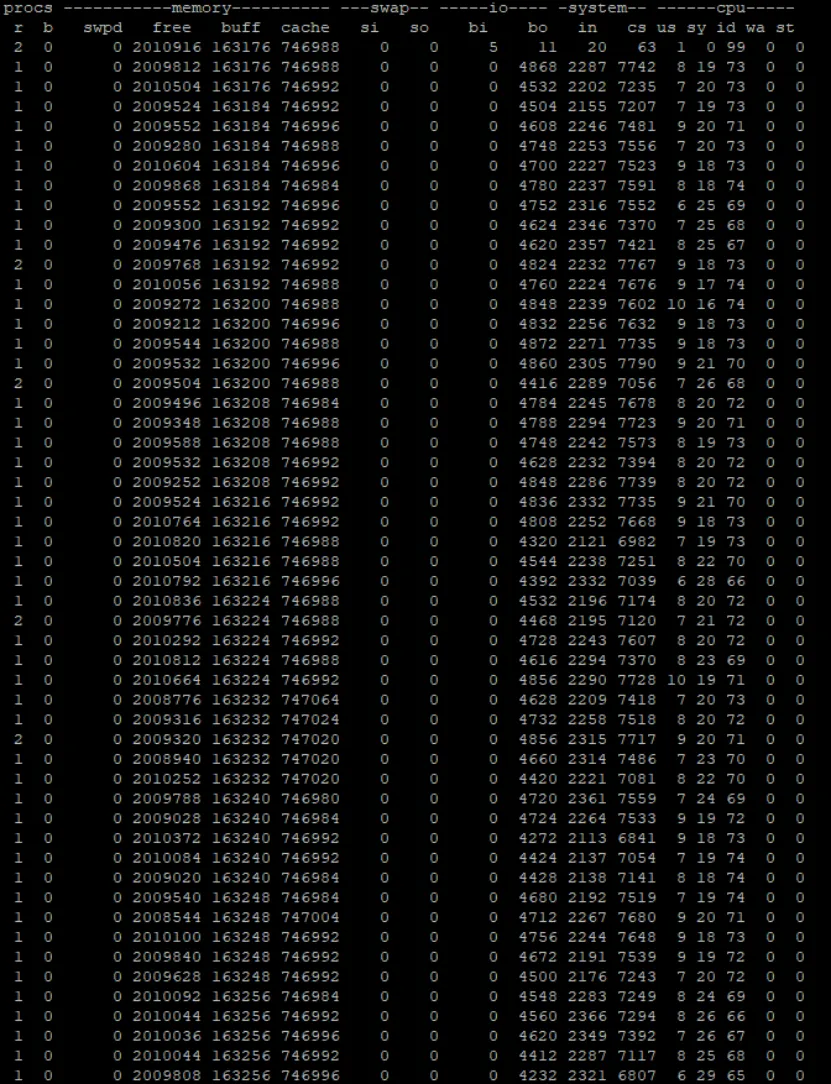 发现, sy有明显的变大的趋势,free有明显的变小趋势, in 和cs 都有明显的变大趋势, id 明显变小, 说明占用的cpu非常多。