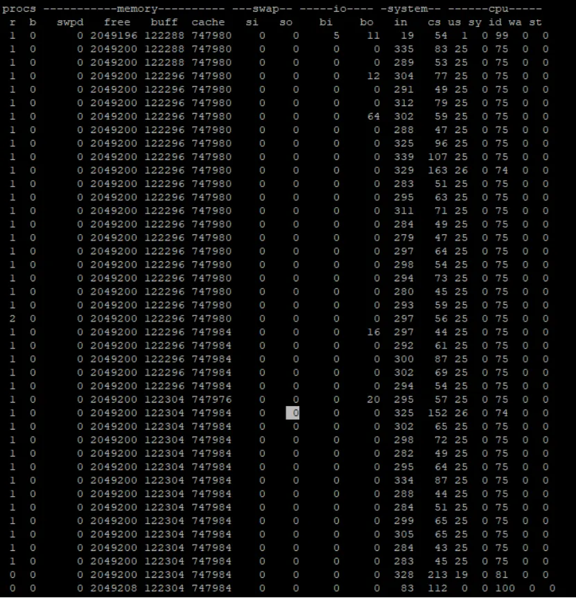 发现, sy和us 都是有变大的趋势,us > sy, 但是free变小不是很明显, 内存没有明显的占用,in 和cs 都有明显的变大趋势, id 明显变小, 说明占用的cpu非常多。