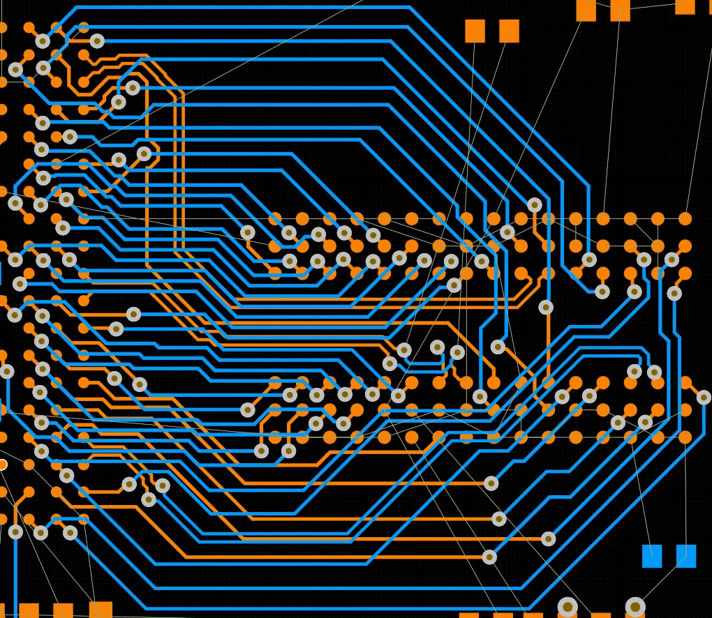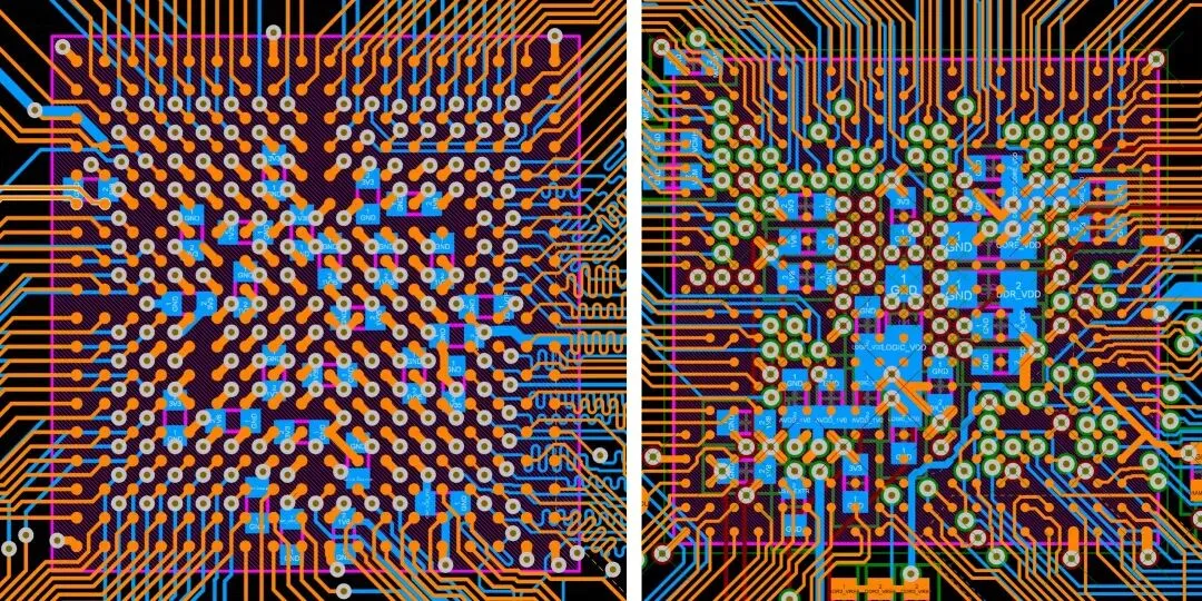 本文评测中主流的 0.8mm 引脚间距 BGA,其间距足够宽松,允许在两个相邻焊球之间布一条走线,并且可以在 4 个焊球组成的网格中心放置过孔,相邻过孔之间的空间也足以容纳一条走线。如左图所示:蓝色(底层)最内侧的信号通过蓝色层最外侧信号的逃逸过孔之间的间隙,实现从 BGA 封装的引出。