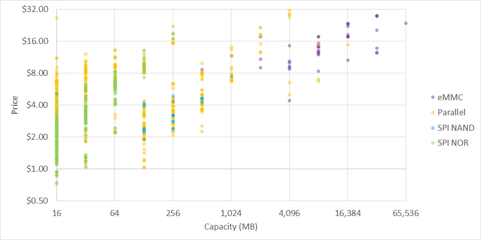 如图,得捷电子(Digi-Key)提供的容量从16MB到64GB的存储器报价,按存储技术类型进行颜色编码区分。
