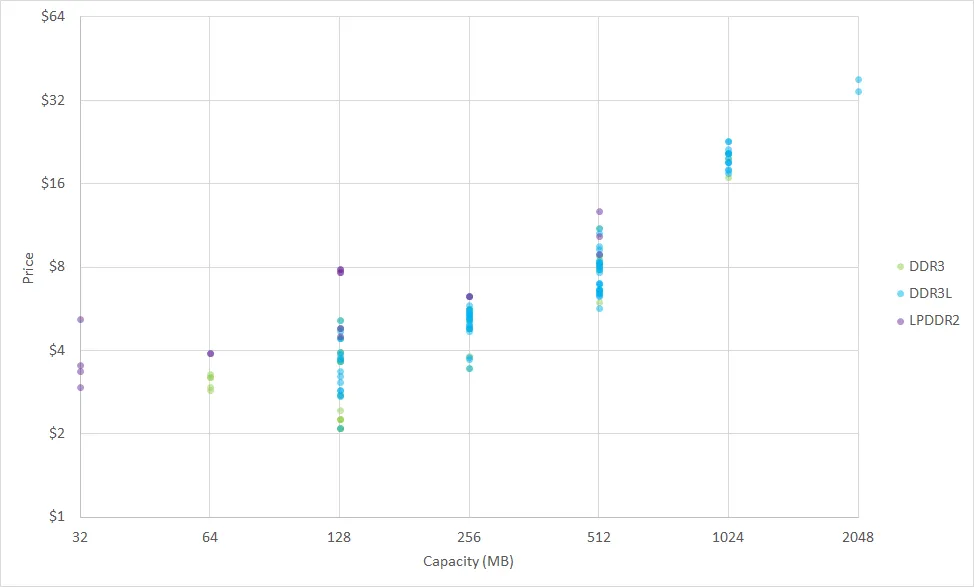 如图,得捷电子(Digi-Key)的最新价格趋势显示,512MB DDR3/DDR3L存储器的性价比最高,而单芯片1GB和2GB规格的价格则要高出30%。