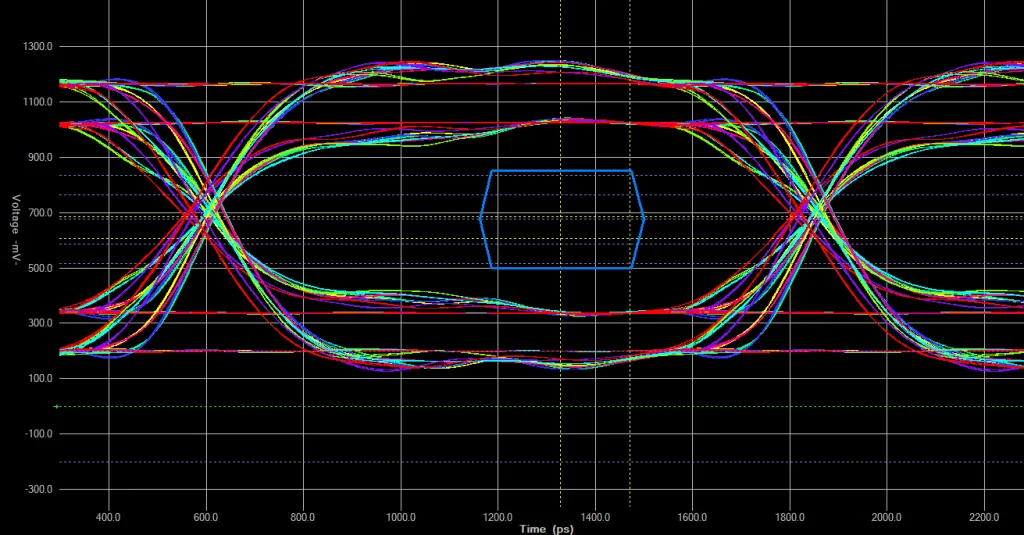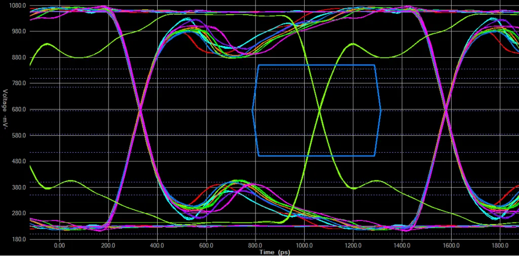 该眼图展示了一组经过严格长度匹配调整的数据,但信号完整性处于临界状态。绿色线条为选通信号,视角取自DRAM芯片的管芯端。蓝色眼图模板代表AC175电平标准下,为DDR3-800运行规格筛选的DDR3L存储器在时钟跳变点附近的建立时间与保持时间要求。