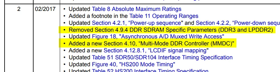 i.MX6UL 的修订历史显示,恩智浦(NXP)实际上删除了 DDR 内存控制器的时序参数。