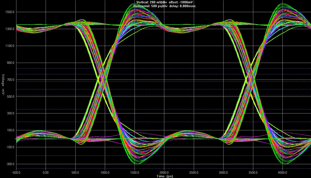 这是采用3倍线宽间距(3S)布线的存储器总线眼图。在约50欧姆微带线上使用40欧姆输出驱动器时,采用33欧姆和80欧姆片上端接(ODT)的差异如下:两者均完全符合严苛的AC175电平标准,但80欧姆端接存在更明显的过冲和振铃现象,而33欧姆端接则出现了不必要的过阻尼情况。信号中的时序偏移是由最短与最长信号间150密耳的长度差导致的。