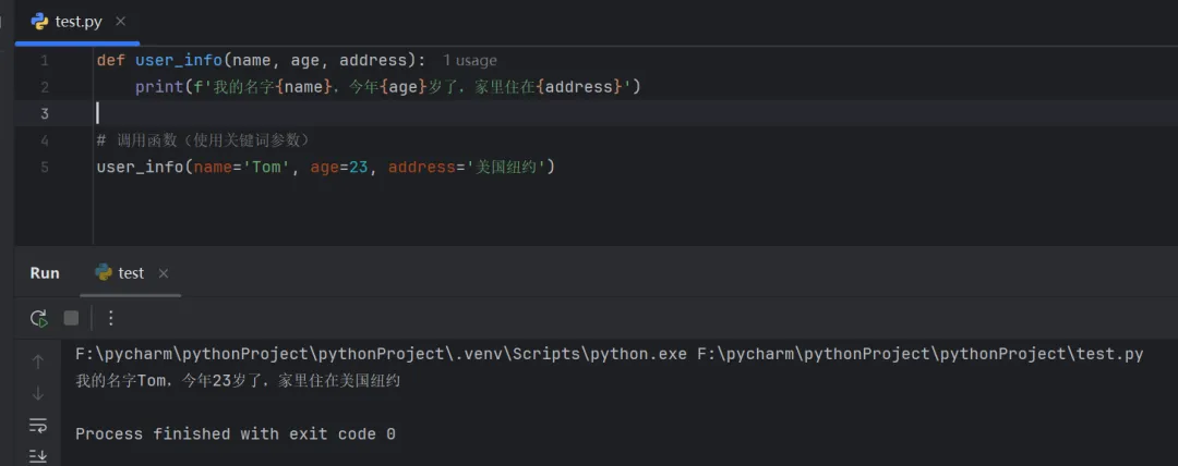 def user_info(name, age, address): print(f'我的名字{name},今年{age}岁了,家里住在{address}')# 调用函数(使用关键词参数)user_info(name='Tom', age=23, address='美国纽约')